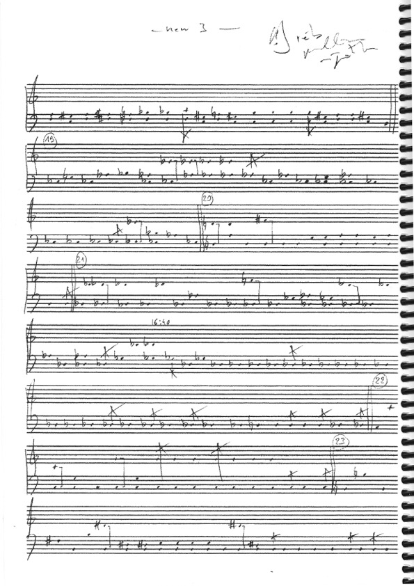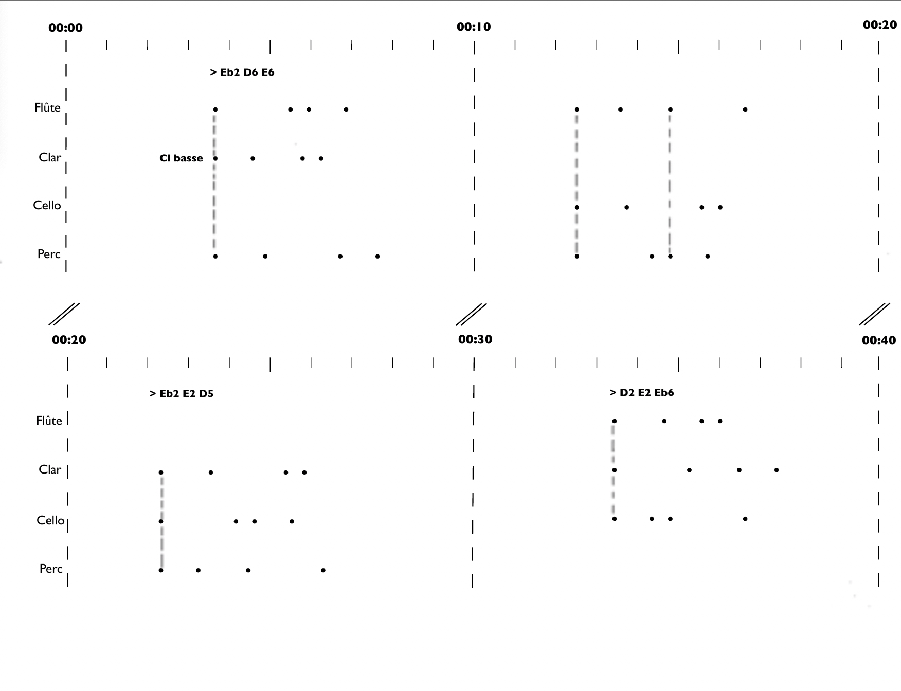 pour sons fixés, piano, basse électrique, flûte, clarinette, cello, percussion